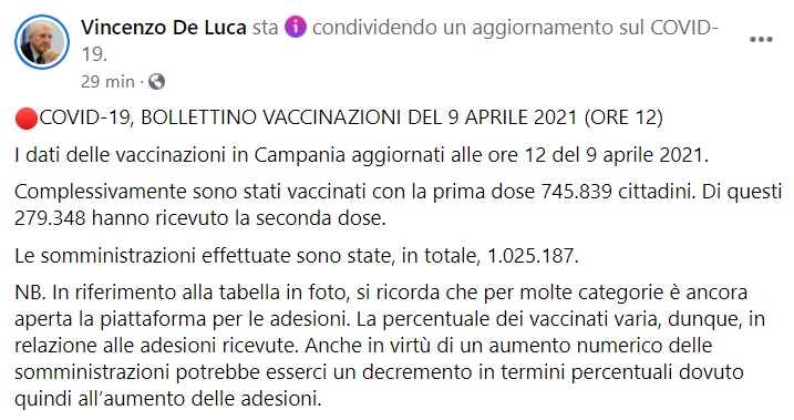 Questo quanto apprendiamo dalla pagina fb del Pres. De Luca: "COVID-19, BOLLETTINO VACCINAZIONI DEL 9 APRILE 2021 (ORE 12) I dati delle vaccinazioni in Campania aggiornati alle ore 12 del 9 aprile 2021. Complessivamente sono stati vaccinati con la prima dose 745.839 cittadini - si legge nella nota -. Di questi 279.348 hanno ricevuto la seconda dose. Le somministrazioni effettuate sono state, in totale, 1.025.187. NB. In riferimento alla tabella in foto, si ricorda che per molte categorie è ancora aperta la piattaforma per le adesioni. La percentuale dei vaccinati varia, dunque, in relazione alle adesioni ricevute. Anche in virtù di un aumento numerico delle somministrazioni - si legge nella nota - potrebbe esserci un decremento in termini percentuali dovuto quindi all’aumento delle adesioni."