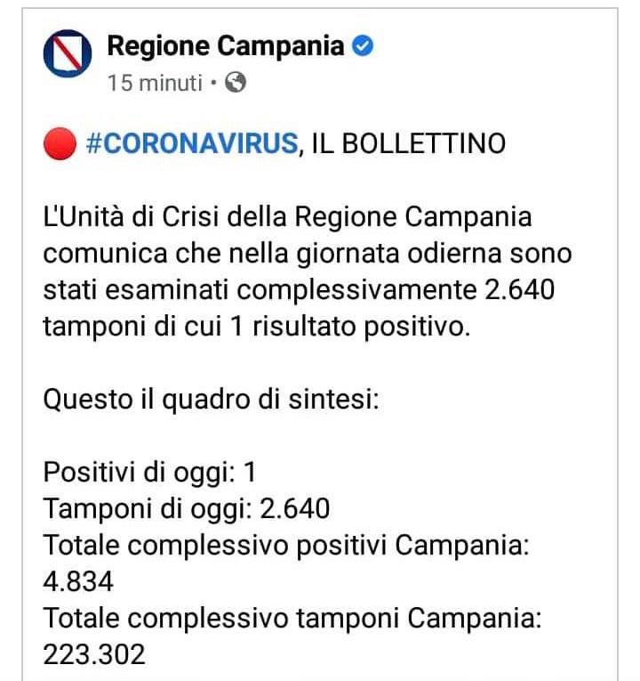 9/6. Agg. Coronavirus. 1 positivo su 2640 tamponi effettuati