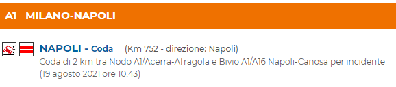 Lo apprendiamo dal sito di Autostrade per l'Italia: "Coda di 2 km tra Nodo A1/Acerra-Afragola e Bivio A1/A16 Napoli-Canosa per incidente".