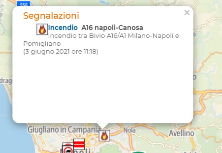 "Incendio A16 Napoli-Canosa. Incendio tra Bivio A16/A1 Milano-Napoli e Pomigliano"