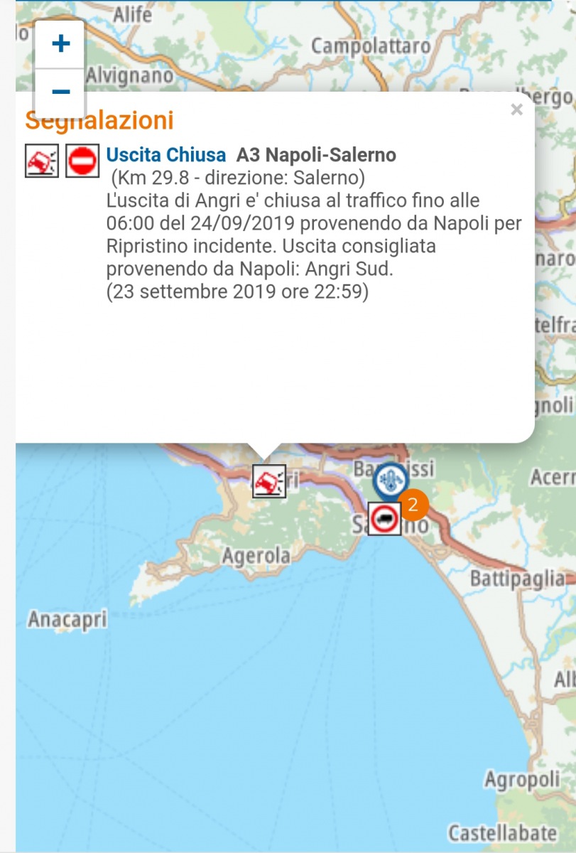 "Uscita Chiusa A3 Napoli-Salerno (Km 29.8 - direzione: Salerno). L'uscita di Angri e' chiusa al traffico fino alle 06:00 del 24/09/2019 provenendo da Napoli per Ripristino incidente. Uscita consigliata provenendo da Napoli: Angri Sud.(23 settembre 2019 ore 22:59)".