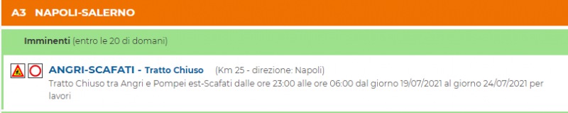 Come apprediamo dal sito di Autostrade per l'Italia dal giorno 19 luglio al giorno 24 luglio dalle ore 23 alle ore 6, il tratto tra Angri e Scafati resterà chiuso al traffico per lavori.