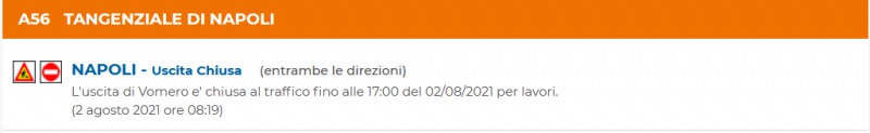 Questo quanto si apprende sul sito Autostrade: " L'uscita di Vomero - si legge - e' chiusa al traffico fino alle 17:00 del 02/08/2021 per lavori".