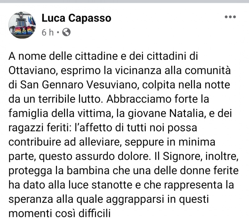 "A nome delle cittadine e dei cittadini di Ottaviano, esprimo la vicinanza alla comunità di San Gennaro Vesuviano, colpita nella notte da un terribile lutto. Abbracciamo forte la famiglia della vittima, la giovane Natalia, e dei ragazzi feriti: l’affetto di tutti noi possa contribuire ad alleviare, seppure in minima parte, questo assurdo dolore. Il Signore, inoltre, protegga la bambina che una delle donne ferite ha dato alla luce stanotte e che rappresenta la speranza alla quale aggrapparsi in questi momenti così difficili".