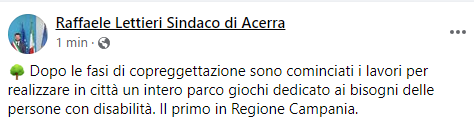Questo il post pubblicato sulla sua pagina Facebook dal Sindaco di Acerra Raffaele Lettieri: "Dopo le fasi di copreggettazione sono cominciati i lavori per realizzare in città un intero parco giochi - si legge nel post - dedicato ai bisogni delle persone con disabilità. Il primo in Regione Campania".