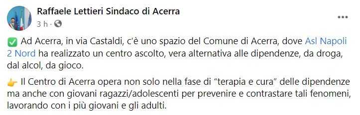 Questo quanto pubblicato sulla pagina fb del Sindaco di ACerra "Ad Acerra, in via Castaldi, c’è uno spazio del Comune di Acerra, dove Asl Napoli 2 Nord ha realizzato un centro ascolto, vera alternativa alle dipendenze, da droga, dal alcol, da gioco. Il Centro di Acerra - si legge nella nota - opera non solo nella fase di “terapia e cura” delle dipendenze ma anche con giovani ragazzi/adolescenti per prevenire e contrastare tali fenomeni, lavorando con i più giovani e gli adulti."