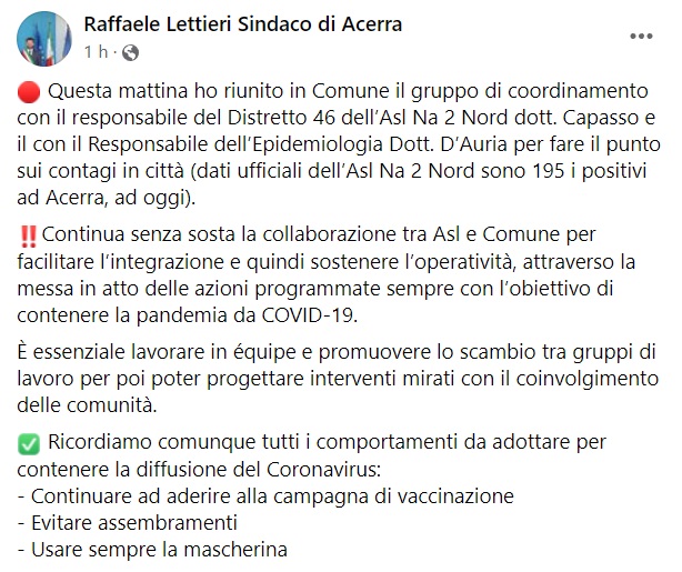 "Questa mattina ho riunito in Comune il gruppo di coordinamento con il responsabile del Distretto 46 dell’Asl Na 2 Nord dott. Capasso e il con il Responsabile dell’Epidemiologia Dott. D’Auria per fare il punto sui contagi in città (dati ufficiali dell’Asl Na 2 Nord sono 195 i positivi ad Acerra, ad oggi). -Si legge nella nota- %u203C%uFE0FContinua senza sosta la collaborazione tra Asl e Comune per facilitare l’integrazione e quindi sostenere l’operatività, attraverso la messa in atto delle azioni programmate sempre con l’obiettivo di contenere la pandemia da COVID-19. È essenziale lavorare in équipe e promuovere lo scambio tra gruppi di lavoro per poi poter progettare interventi mirati con il coinvolgimento delle comunità. -Si legge nella nota- Ricordiamo comunque tutti i comportamenti da adottare per contenere la diffusione del Coronavirus: - Continuare ad aderire alla campagna di vaccinazione - Evitare assembramenti - Usare sempre la mascherina"