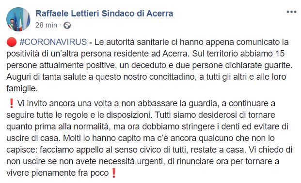Questo quanto pubblicato sulla pagina facebook del Sindaco Lettieri: