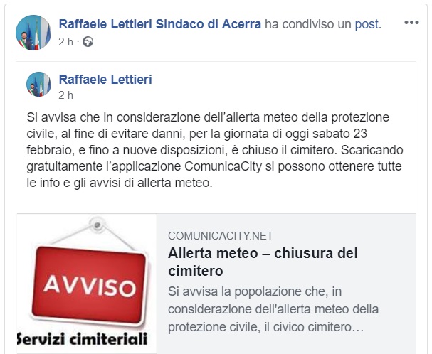 Lo apprendiamo dal profilo Facebook del Sindaco di Acerra Raffaele Lettieri