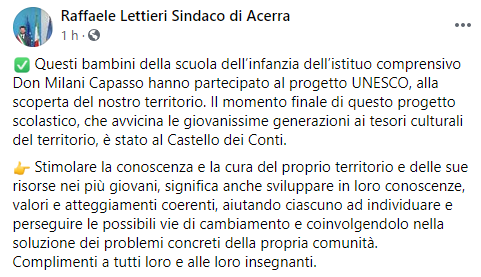 Questo il post pubblicato sulla sua pagina Facebook dal Sindaco di Acerra Raffaele Lettieri: "Questi bambini della scuola dell’infanzia dell’istituo comprensivo Don Milani Capasso hanno partecipato al progetto UNESCO, alla scoperta del nostro territorio. Il momento finale di questo progetto scolastico - si legge nel post - che avvicina le giovanissime generazioni ai tesori culturali del territorio, è stato al Castello dei Conti. Stimolare la conoscenza e la cura del proprio territorio e delle sue risorse nei più giovani, significa anche sviluppare in loro conoscenze, valori e atteggiamenti coerenti, aiutando ciascuno ad individuare e perseguire le possibili vie di cambiamento e coinvolgendolo nella soluzione dei problemi - prosegue il post - concreti della propria comunità.m Complimenti a tutti loro e alle loro insegnanti".