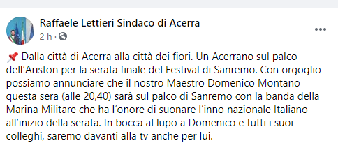 Questo il post pubblicato sulla sua pagina Facebook dal Sindaco di Acerra Raffaele Lettieri: "Dalla città di Acerra alla città dei fiori. Un Acerrano sul palco dell’Ariston per la serata finale del Festival di Sanremo. Con orgoglio - ha scritto il Sindaco - possiamo annunciare che il nostro Maestro Domenico Montano questa sera (alle 20,40) sarà sul palco di Sanremo con la banda della Marina Militare che ha l’onore di suonare l’inno nazionale Italiano all’inizio della serata. In bocca al lupo a Domenico - conclude il Sindaco - e tutti i suoi colleghi, saremo davanti alla tv anche per lui".