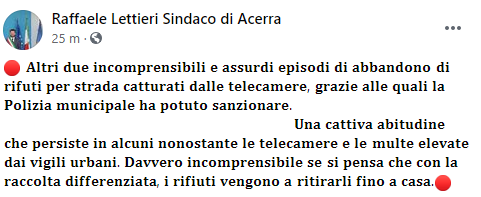 Questo parte del post pubblicato sulla sua pagina Facebook dal Sindaco di Acerra Raffaele Lettieri: "Altri due incomprensibili e assurdi episodi di abbandono di rifiuti per strada catturati dalle telecamere, grazie alle quali la Polizia municipale - si legge nel post - ha potuto sanzionare (...). Una cattiva abitudine che persiste in alcuni nonostante le telecamere e le multe elevate dai vigili urbani. Davvero incomprensibile - conclude il post - se si pensa che con la raccolta differenziata i rifiuti vengono a ritirarli fino a casa (...).