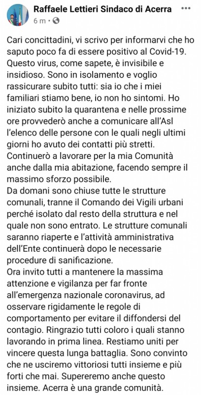 Lo apprendiamo dalla pagina Facebook del Sindaco di Acerra, Raffaele Lettieri.