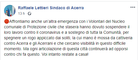 "Affrontiamo anche un’altra emergenza con i Volontari del Nucleo comunale di Protezione civile che stasera hanno dovuto sospendere il loro lavoro contro il coronavirus e a sostegno di tutta la Comunità, per spegnere un rogo appiccato dai soliti, la cui mano è mossa da cattiveria contro Acerra e gli Acerrani e che cercano visibilità in questo difficile momento. Ma ogni articolazione di questa città continuerà ad opporsi contro chi fa questo. Voi intanto restate a casa!"
