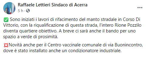 Questo il post pubblicato sulla sua pagina Facebook dal Sindaco di Acerra Raffaele Lettieri: "Sono iniziati i lavori di rifacimento del manto stradale in Corso Di Vittorio, con la riqualificazione di questa strada, l'intero Rione Pozzilo - si legge nel post - diventa quartiere obiettivo. A breve ci sarà anche il bando per uno spazio a verde di prosimità. Novità anche per il Centro vaccinale comunale di via Buonincontro, dove è stato installato anche un condizionatore industriale".