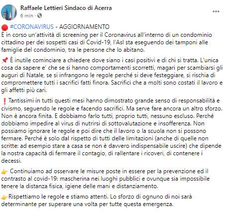 Lo apprendiamo dalla pagina Facebook del Sindaco di Acerra Raffaele Lettieri