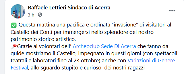 Questo il post pubblicato sulla pagina Facebook del sindaco di Acerra, Raffaele Lettieri: "Questa mattina una pacifica e ordinata “invasione” di visitatori al Castello dei Conti per immergersi nello splendore del nostro patrimonio storico artistico. Grazie ai volontari dell’ Archeoclub Sede Di Acerra - si legge nel post - che fanno da guide mostriamo il Castello, impegnato in questi giorni (con spettacoli teatrali e laboratori fino al 23 ottobre) anche con Variazioni di Genere Festival, allo sguardo stupito e curioso dei nostri ragazzi - conclude".