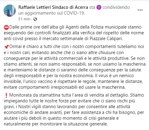Lo apprendiamo dalla pagina Facebook del Sindaco di Acerra Raffaele Lettieri