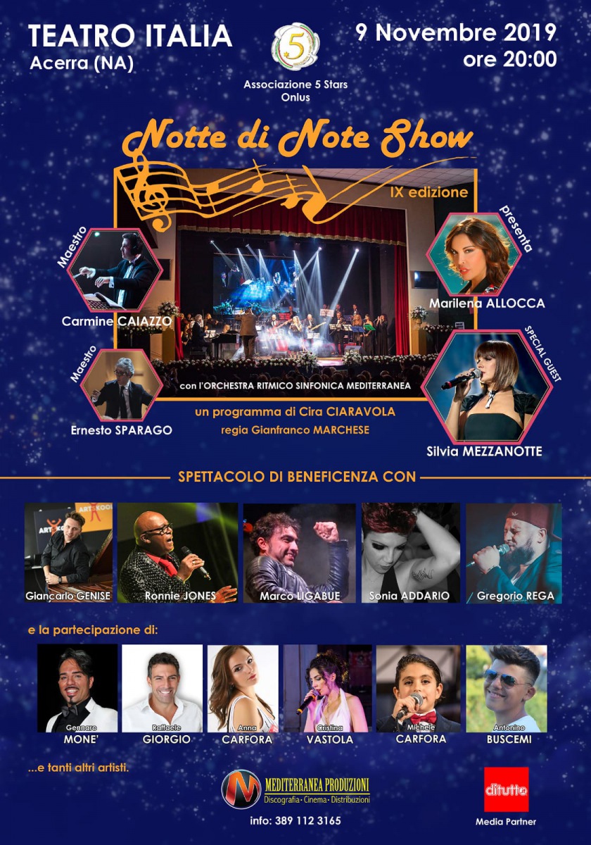 "Si terrà il 9 novembre prossimo a partire dalle ore 20,00 presso il Teatro Italia di Acerra (Na), l’evento “Notte di Note Show” lo spettacolo di beneficenza per gli ammalati di leucemia, giunto alla sua IX edizione, ideato dal Direttore d’Orchestra Carmine Caiazzo, reduce dal grande successo del talk show “All Together Now” sulle reti Mediaset, dove il suo nome era nell’elenco dei 100 giudici del muro. Per l’occasione- si legge nella nota- molti gli ospiti internazionali, che hanno già confermato la loro presenza per questa nobile causa, tra i quali: la cantante Silvia Mezzanotte, il cantante e compositore jazz Ronnie Jones, il cantautore e compositore Marco Ligabue, la cantante soul Sonia Addario, il vincitore della prima edizione del programma Mediaset “All Together Now” Gregorio Rega, il vocal coach dei big della canzone italiana Giancarlo Genise, Ilenia Carfora, Anna Carfora, il giovane attore e cantante Michele Carfora, Raffaele Giorgio, Antonino Buscemi, Maria Magdalena Milczarek, Vittoria Leanza, Cristina Vastola, il tenore Gennaro Monè Pedagno e Antonio Caiazzo. Alla conduzione della serata la splendida Marilena Allocca attrice teatrale e cantante, che recentemente abbiamo potuto ammirare anche come interprete del brano “Testarda” di cui ha realizzato anche il videoclip prodotto dalla casa discografica e cinematografica “Mediterraneacinema” di cui Carmine Caiazzo ne è il Presidente. La serata musicale- si legge nel comunicato- vedrà la partecipazione dell’Orchestra Ritmico-Sinfonica Mediterranea’ che sarà diretta dai Maestri Carmine Caiazzo ed Ernesto Sparago. La regia invece è stata affidata a Gianfranco Marchese, la direzione artistica è a cura di Cira Ciaravola, quella esecutiva sarà a cura della Mediterranea produzioni e a Gianni Luciano sarà affidata invece la direzione della fotografia. Quando la solidarieta’, si accompagna con un sorriso- si legge nella nota- è più facile infondere nel cuore di chi la riceve, la speranza di una vita migliore, dignitosa e sana per tutti. Chiunque volesse può donare con Conto PAYPAL [email protected]; con Coordinate bancarie 5 Stars Associazione