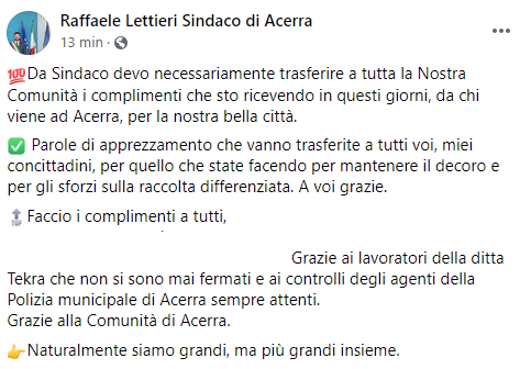 Questo parte del post pubblicato sulla sua pagina Facebook dal Sindaco di Acerra Raffaele Lettieri: "Da Sindaco devo necessariamente trasferire a tutta la Nostra Comunità i complimenti che sto ricevendo in questi giorni, da chi viene ad Acerra, per la nostra bella città. Parole di apprezzamento - si legge nel post - che vanno trasferite a tutti voi, miei concittadini, per quello che state facendo per mantenere il decoro e per gli sforzi sulla raccolta differenziata. A voi grazie. Faccio i complimenti a tutti - prosegue il post - (...). Grazie ai lavoratori della ditta Tekra - prosegue il post - che non si sono mai fermati e ai controlli degli agenti della Polizia municipale di Acerra sempre attenti. Grazie alla Comunità di Acerra. Naturalmente siamo grandi, ma più grandi insieme".