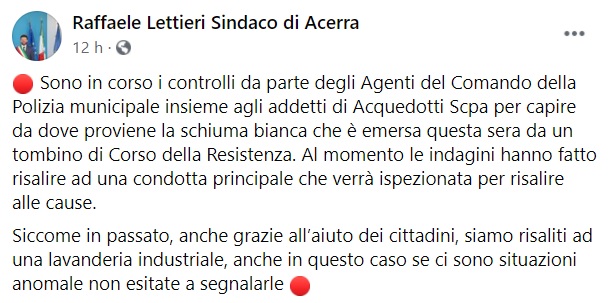 "Sono in corso i controlli da parte degli Agenti del Comando della Polizia municipale insieme agli addetti di Acquedotti Scpa per capire da dove proviene la schiuma bianca che è emersa- si legge nella nota- questa sera da un tombino di Corso della Resistenza. Al momento le indagini hanno fatto risalire ad una condotta principale che verrà ispezionata per risalire alle cause. Siccome in passato, anche grazie all’aiuto dei cittadini, siamo risaliti ad una lavanderia industriale, anche in questo caso- si legge nella nota- se ci sono situazioni anomale non esitate a segnalarle"