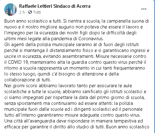 Lo apprendiamo dalla pagina Facebook di Raffaele Lettieri, Sindaco di Acerra.
