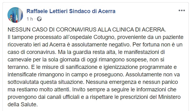 Questo quanto comunicato dal Sindaco di Acerra Lettieri
