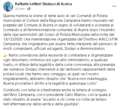 Lo apprendiamo dalla pagina Facebook di Raffaele Lettieri, Sindaco di Acerra.