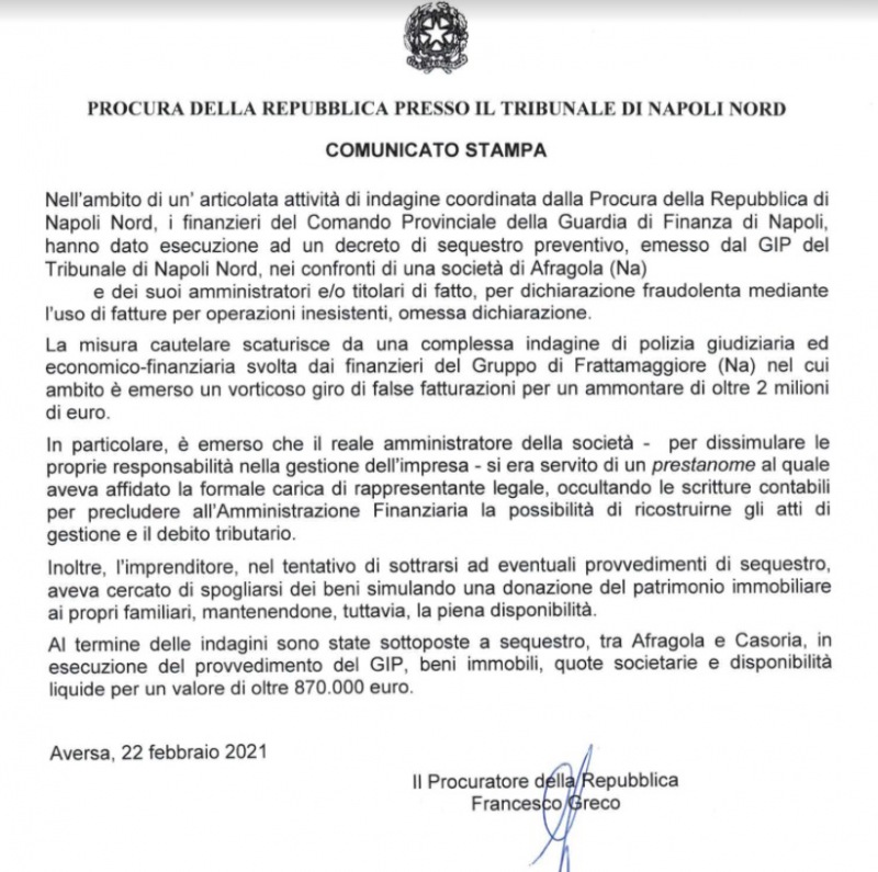 Pubblichiamo nota stampa congiunta Procura di Napoli Nord e Guardia di Finanza Napoli: "FALSE FATTURAZIONI PER OLTRE 2 MILIONI DI EURO. SEQUESTRATI AD IMPRENDITORE ... BENI DEL VALORE DI 870.000 EURO.