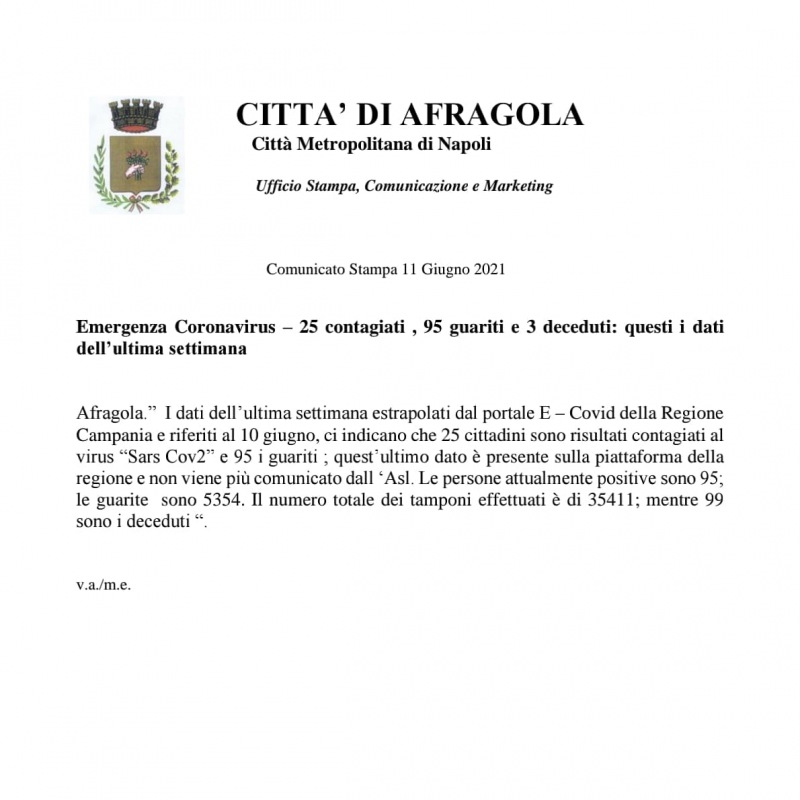 Questo il report sulla situazione epidemiologica nell'ultima settimana pubblicato sulla pagina Facebook 'Città di Afragola'