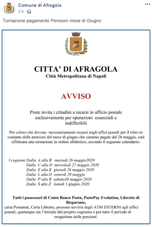 Questo quanto apprendiamo dalla pagina facebook del Comune di Afragola: