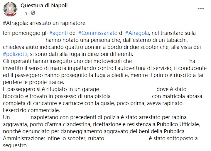 Questo quanto apprendiamo dalla pagina fb della Questura di Napoli: "Afragola: arrestato un rapinatore. Ieri pomeriggio gli agenti del Commissariato di Afragola, nel transitare sulla ..., hanno notato una persona che, dall’esterno di un tabacchi - si legge nella nota -, chiedeva aiuto indicando quattro uomini a bordo di due scooter che, alla vista dei poliziotti, si sono dati alla fuga in direzioni differenti. Gli operanti hanno inseguito uno dei motoveicoli che ... ha invertito il senso di marcia impattando contro l’autovettura di servizio; il conducente ed il passeggero hanno proseguito la fuga a piedi - si legge nella nota - e, mentre il primo è riuscito a far perdere le proprie tracce. Il passeggero si è rifugiato in un garage ... dove è stato bloccato e trovato in possesso di una pistola ... con matricola abrasa completa di caricatore e cartucce con la quale, poco prima, aveva rapinato l’esercizio commerciale. Un ... napoletano con precedenti di polizia è stato arrestato per rapina aggravata, porto d’arma clandestina, ricettazione e resistenza a Pubblico Ufficiale, nonché denunciato per danneggiamento aggravato dei beni della Pubblica Amministrazione - si legge nella nota -; infine lo scooter, rubato ..., è stato sottoposto a sequestro."