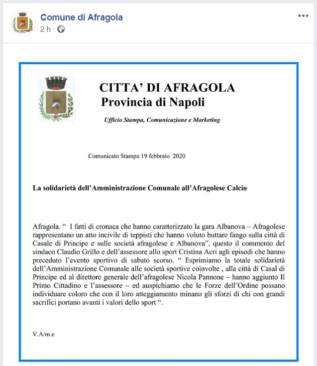 Questo quanto pubblicato sulla pagina FB del Comune di Afragola