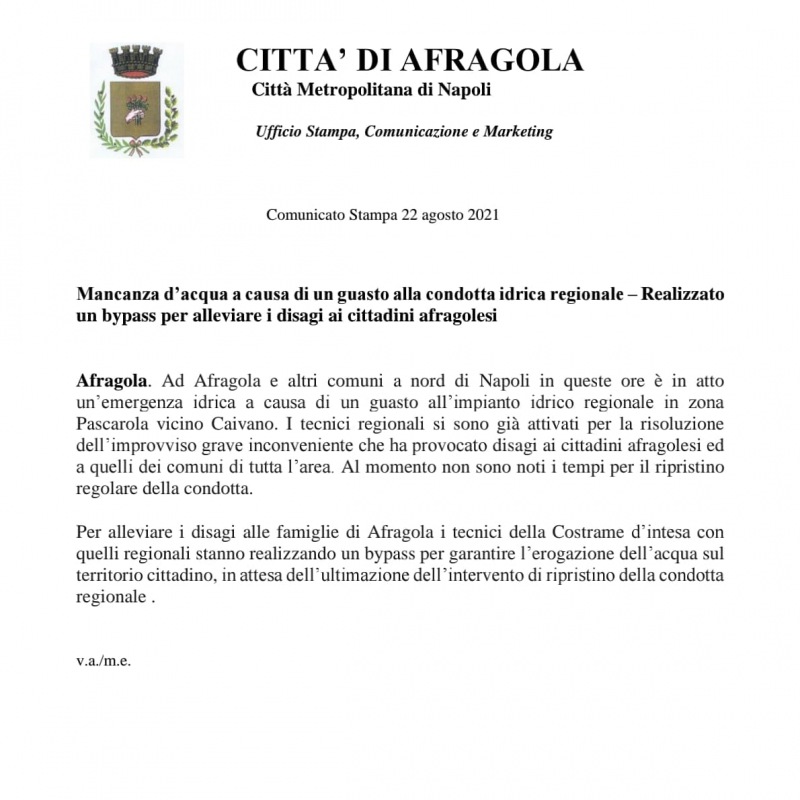 Questo il comunicato stampa diffuso dall'amministrazione comunale di Afragola attraverso la pagina Facebook 'Comune di Afragola'