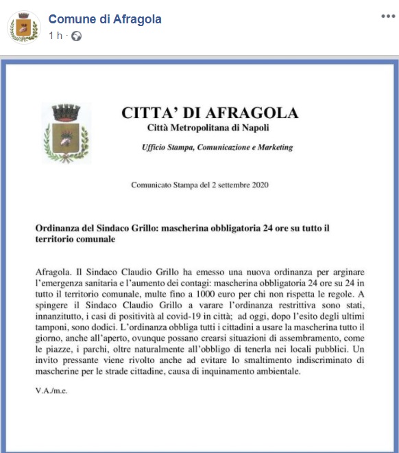Questo quanto apprendiamo dalla pagina facebook del Comune di Afragola: