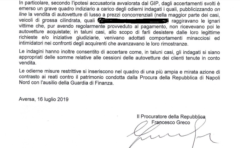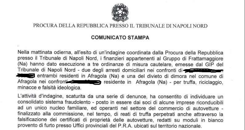 Questo parte del comunicato inviatoci dalla Procura della Repubblica presso il Tribunale di Napoli Nord.