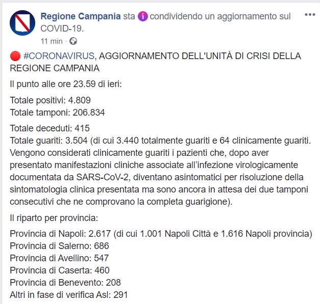 Questo quanto pubblicato da Regione Campania