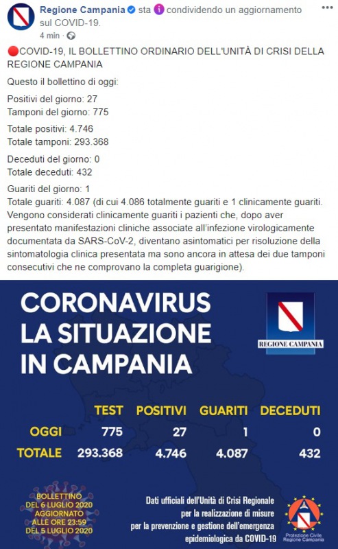 Questo quanto pubblicato sulla pagina facebook della Regione Campania: