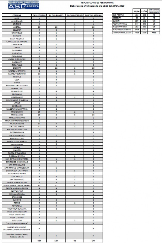 Questi i dati pubblicati dall'ASL Caserta sul proprio sito internet ripartiti Comune per Comune