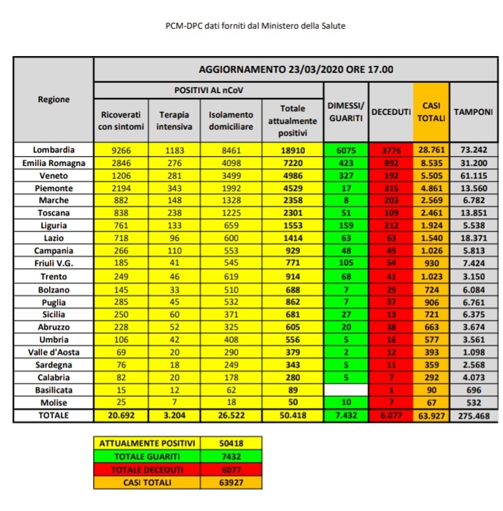 Questi i dati comunicati dal Ministero della Salute in merito ai contagi da Coronavirus. Il dato nazionale dice che vi sono 50.418 positivi. Su un totale di 63.927 contagiati, 7.432 sono i guariti e 6.077 i decessi.