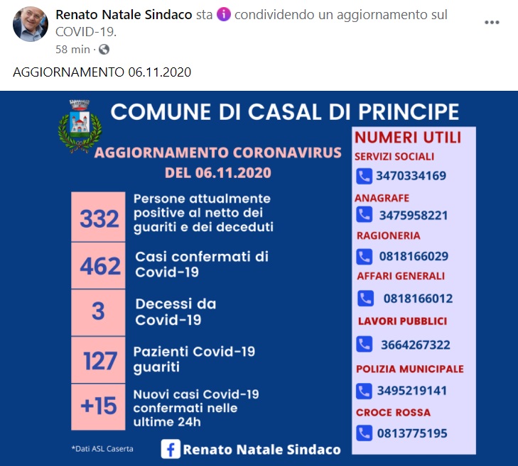 Questo quanto pubblicato sulla pagina facebook del Sindaco Natale: