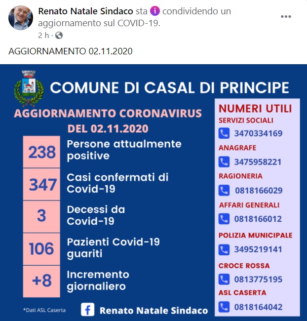 Questo quanto pubblicato sulla pagina facebook del Sindaco Natale: