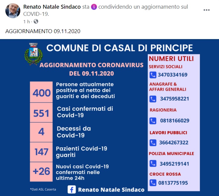 Questo quanto pubblicato sulla pagina facebook del Sindaco Natale: