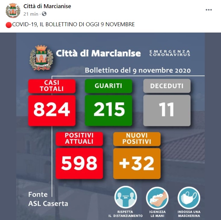 Questo quanto pubblicato sulla pagina facebook del Comune di Marcianise: