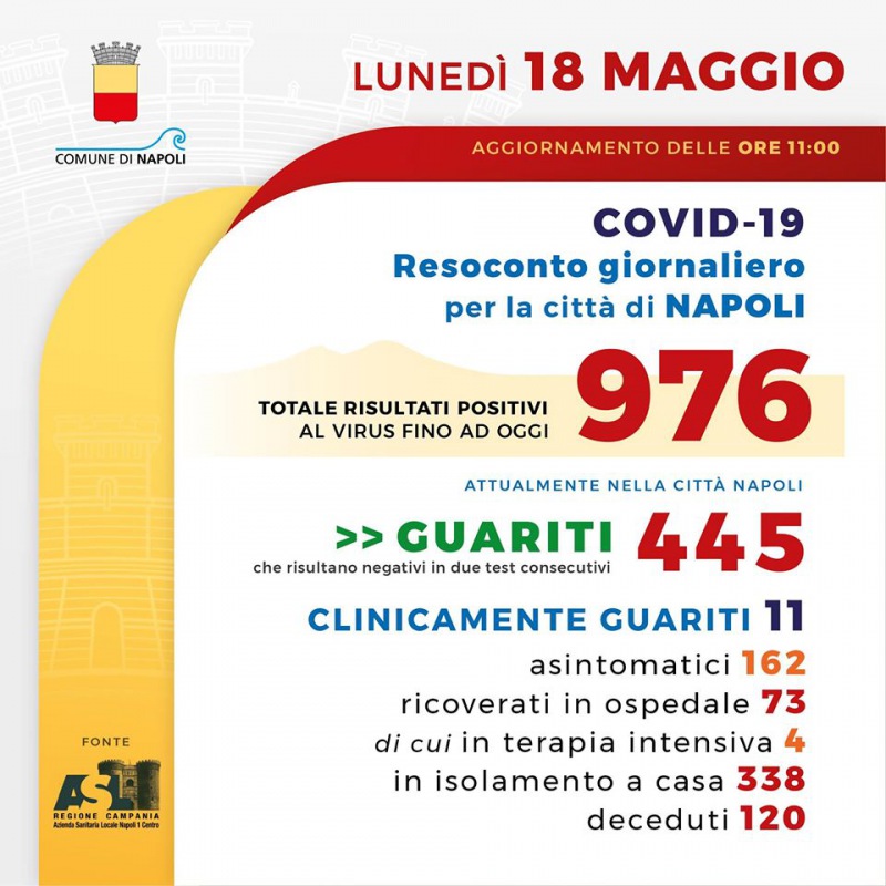 AGG. CORONAVIRUS a NA 18/05. "Resoconto giornaliero rispetto alla situazione dei contagi"