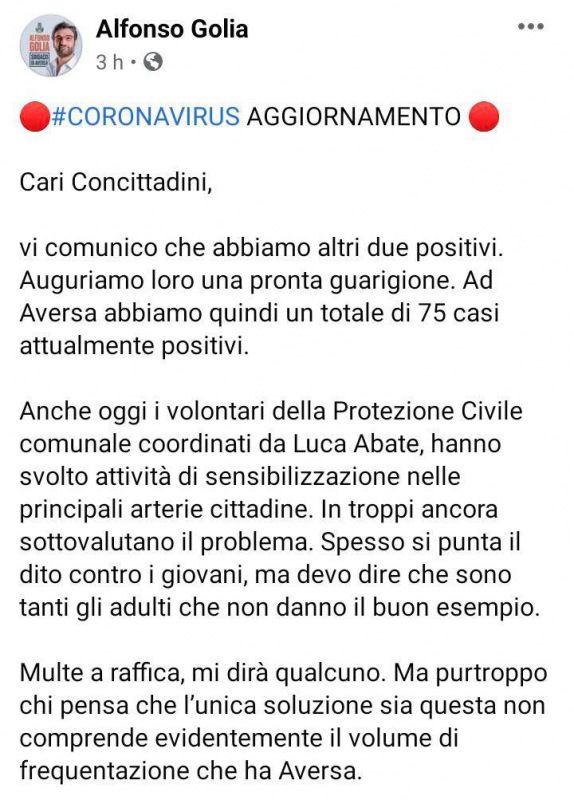 Agg. Coronavirus AGRO AVERSANO. "Altri 2 positivi. Sottovalutano il problema, tanti adulti non danno il buon esempio"
