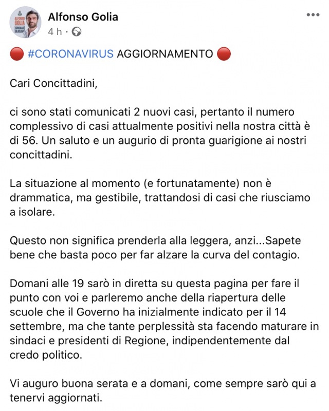 Questo quanto comunicato dal Sindaco Golia