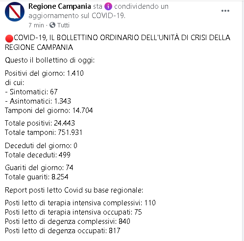 Lo apprendiamo dalla pagina Facebook della Regione Campania.