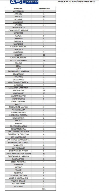 Questo quanto comunicato dall'ASL Caserta riguardo ai contagi Comune per Comune