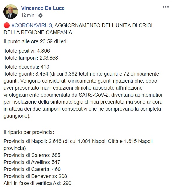Questo quanto pubblicato sulla pagina facebook del Pres. De Luca: